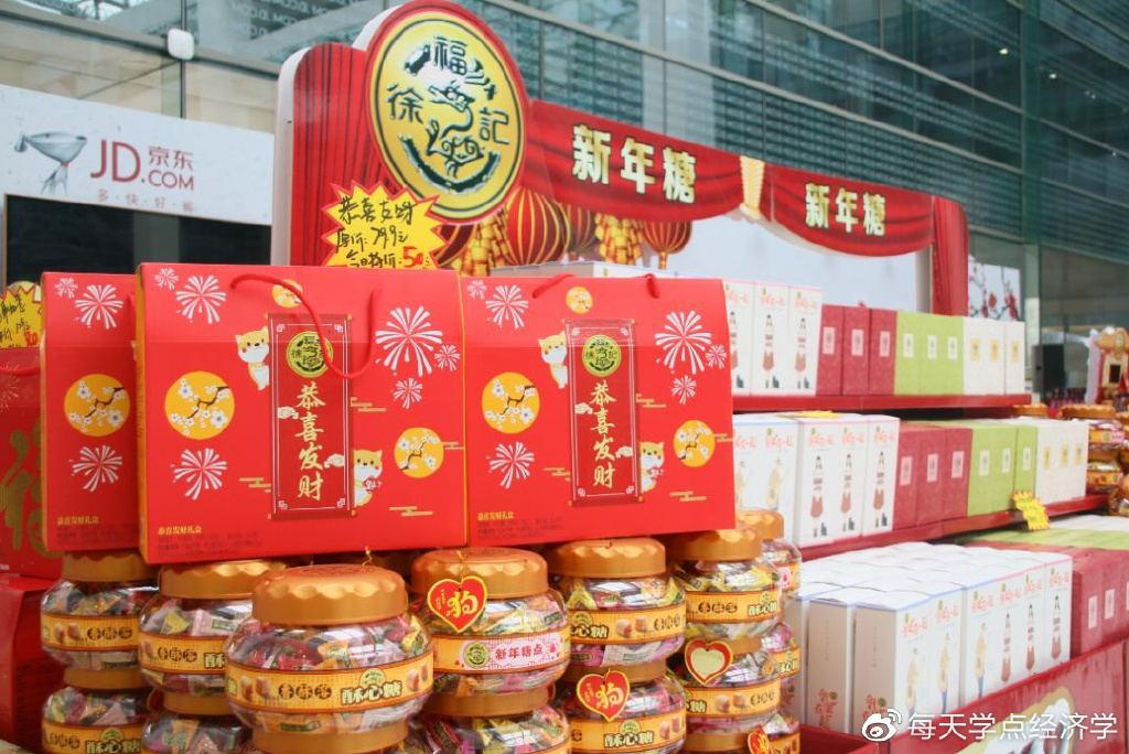 另外徐福记能在新年糖中脱颖而出,离不开它的市场策略:散装统一定价的方式既能满足人们对糖果不同口味的的需求,又能简化购物流程,专柜模式更是强化了徐福记的定位,增加了品牌曝光度。