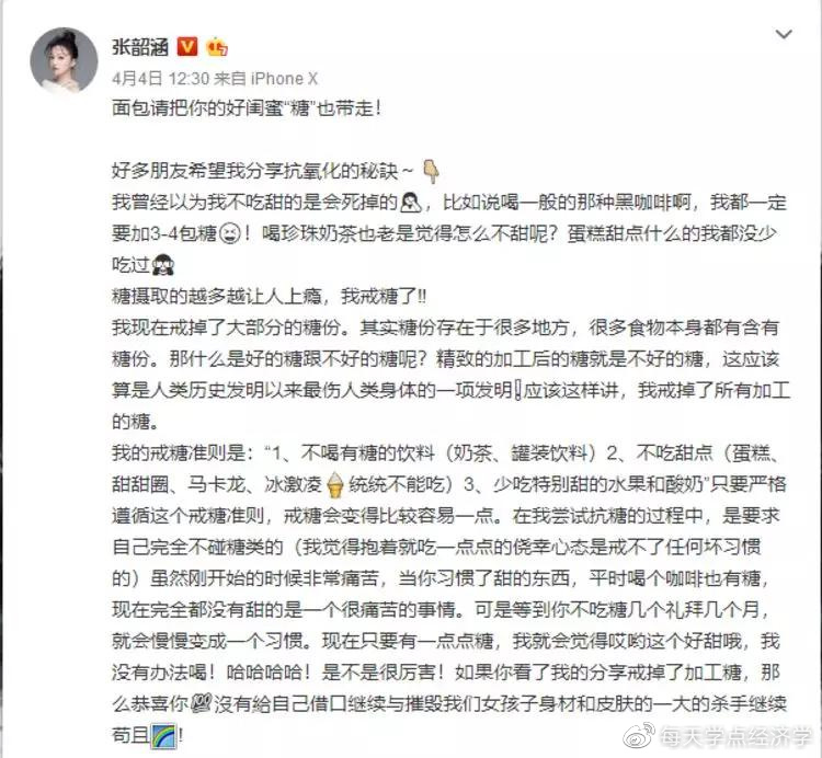 另外,众多明星开始在互联网上透露自己“抗糖”、“戒糖”的生活小妙招,精细到带糖的任何饮料及食物,将戒糖生活发挥到了极致。