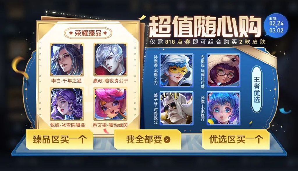 此外,还有一个活动,将于周五开启,就是可以自由选择两款皮肤,以远低于原来的价值进行入手。不过,这几款皮肤之中,左边是史诗,右边的只是勇者和伴生。而即便是左边的史诗,好一点的也就是李白的千年之狐和嬴政的暗夜贵公子。其他两款都是碎片商店的常客。而还需要知道一点,千年之狐是788,而非888。而暗夜贵公子,曾经加入过碎片商店。这样一说,如何取舍,应该心里有数了吧。