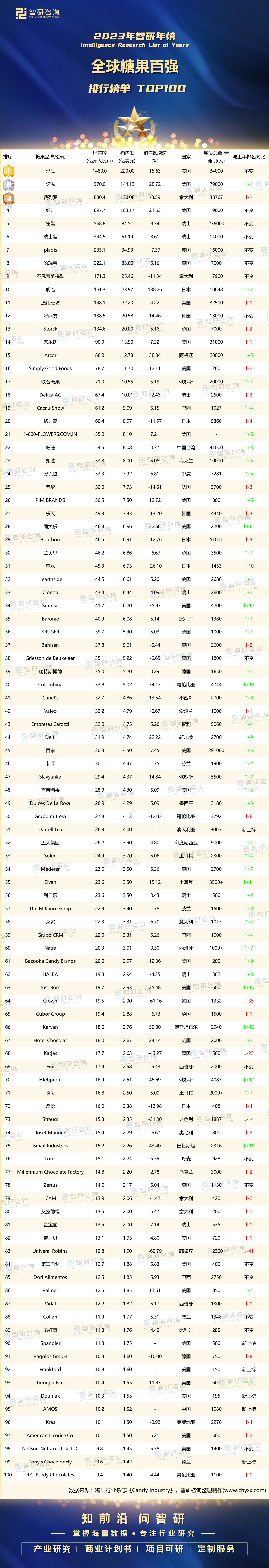 榜单中除了6家新上榜企业,68家企业销售额均比上年上榜时有所增加,其中日本的明治增速为138.3%,26家企业糖果销售额同比有所下降,菲律宾的Univeral Robina下降幅度最大,从2022年的42名下降至83名。