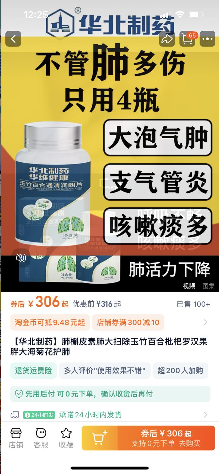声称官方授权直营店铺的“华北制药护肺清肺中心”淘宝店,针对该产品的宣传视频中,出现“不管肺多伤,只用4瓶,大泡气肿、支气管炎、咳嗽痰多”的字样,更在视频中明言:“吸烟、咳嗽影响家庭、工作和正常生活,担心恶化进展,务必进行调养干预,改善肺组织细胞,针对肺部不良组织进行科学调理,每日2次,每次1片(下方配该产品图片),有效改善肺部问题,恢复肺部健康”。该视频也在顺景大健康淘宝店等多家淘宝店出现。